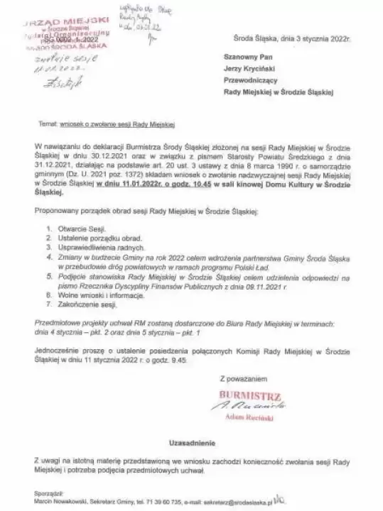 Nadzwyczajna sesja Rady Miejskiej odbędzie się w związku z pismem Pana Starosty Średzkiego Krzysztofa Szałankiewicza z 31 grudnia ub.r. wyznaczającym termin podpisania porozumień z gminami.