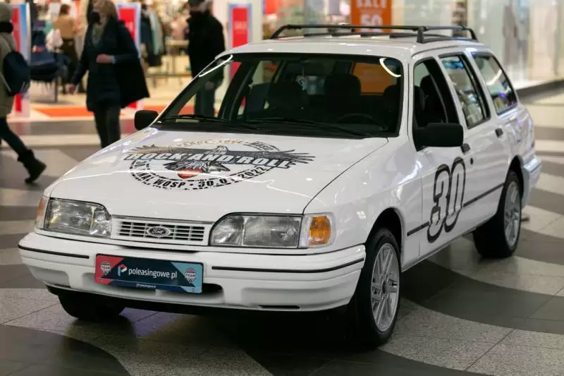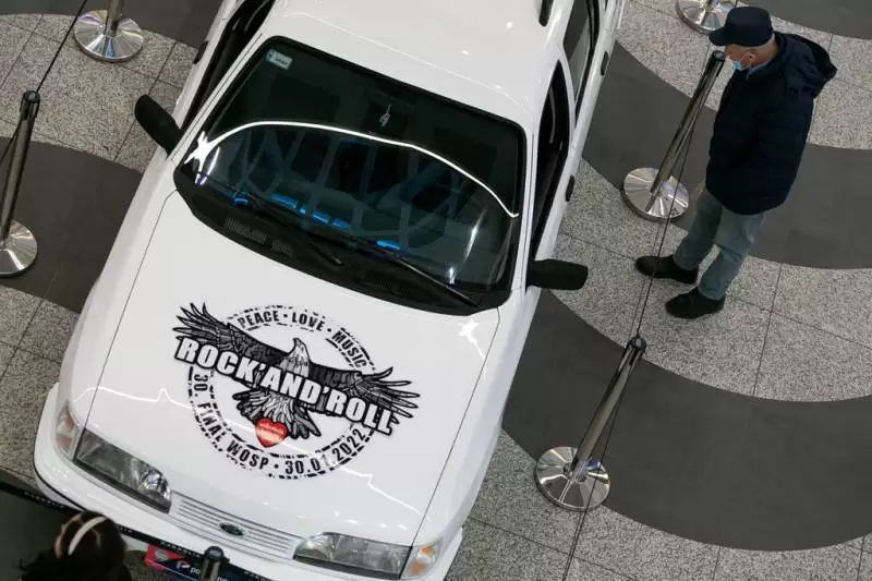 Biały Ford Sierra kombi stoi przy wejściu głównym do Magnolii Park, przy schodach ruchomych. Obok auta Jurek Owsiak z wielkiego plakatu zaprasza na jej aukcję WOŚP na Allegro. Internetowa licytacja ruszyła w czwartek 13 stycznia, od złotówki. W sobotę rano cena przekroczyła 35 tys. zł.