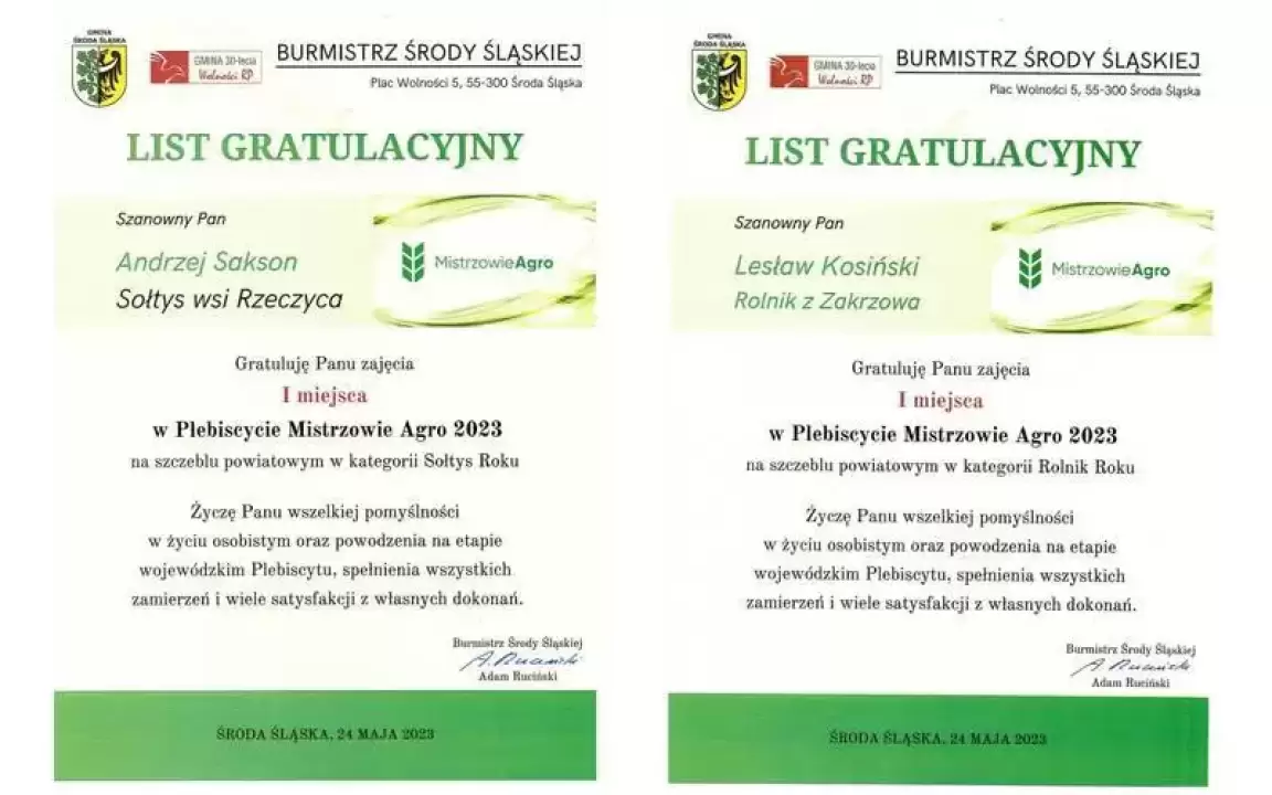 W powiecie średzkim laureatem w kategorii Rolnik Roku został Pan Lesław Kosiński, rolnik z Zakrzowa. W tej kategorii nagradzani są rolnicy wszelkich specjalizacji działający we wszystkich gałęziach rolnictwa. Mniej istotna jest w tym przypadku wielkość prowadzonego gospodarstwa. Ważna jest za to postawa rolnika, jego rola w społeczności.