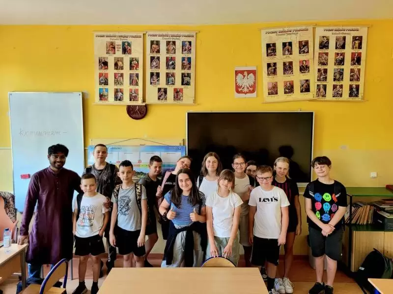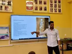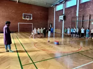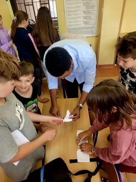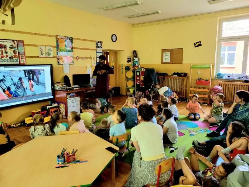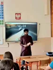 Tarang Agrawal przybył do nas z miasta Ratlam w Indiach i od 7 lat mieszka i pracuje we Wrocławiu. Uczniowie z ogromnym zainteresowaniem słuchali o kulturze, tradycjach i świętach- poznaliśmy Diwali (Święto Świateł) oraz Holi (Święto Kolorów). Dowiedzieliśmy się dlaczego krowy i kozy są w Indiach tak ważne a słoniom maluje się trąby. Zobaczyliśmy też, jakie zwierzęta można spotkać na ulicach. Na koniec mieliśmy okazję skosztować jednej z indyjskich przekąsek - Pani Puri. Dla chętnych nie zabrakło też malowania henną, co cieszyło się dużą popularnością wśród naszych uczennic. Uczniowie z młodszych klas mogli poznać gry i zabawy popularne w Indiach, klasy 7a i 8a uczestniczyły w grze symulacyjnej Bafa Bafa.