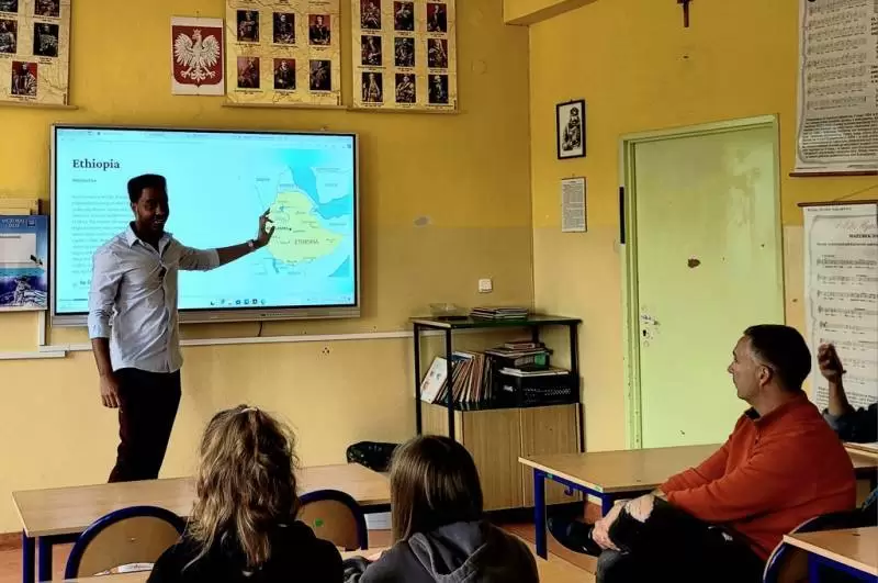 Zelalem Mekonnen pochodzi z Etiopii i również od kilku lat mieszka i pracuje we Wrocławiu. Podczas warsztatów opowiedział nam kilka ciekawostek o swoim kraju, m.in. tym, że to właśnie z Etiopii pochodzi kawa, istnieje tam aż 86 grup etnicznych i każda z nich posiada swój własny język, alfabet składa się z aż 280 znaków a rok ma 13 miesięcy! W Etiopii występuje też ponad 100 gatunków zwierząt, których nie spotkamy nigdzie indziej na świecie. Jest to też jedyny kraj w Afryce, który nigdy nie został skolonizowany i do dzisiaj z tego powodu jest przykładem dla innych państw walczących o niezależność.