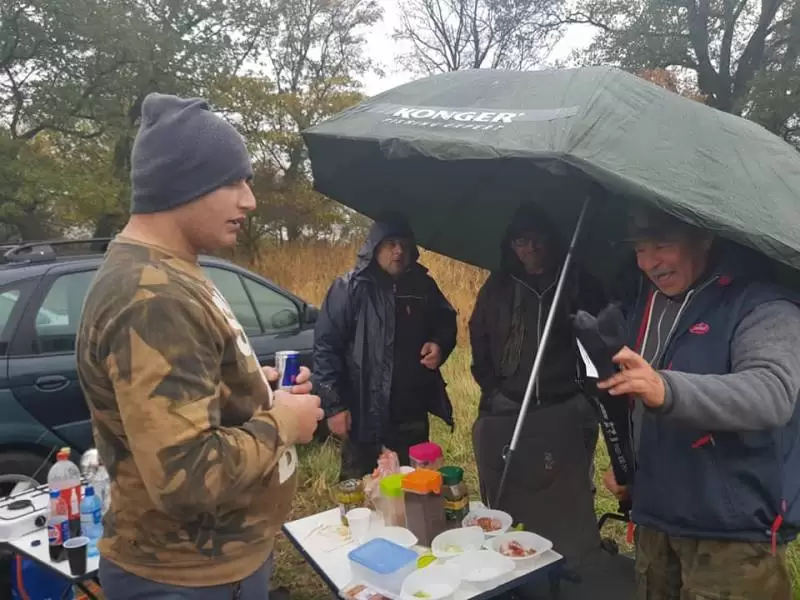 Wędkowanie zakończono przy kiełbaskach pieczonych nad ogniskiem, a miła atmosfera dopisywała pomimo chłodu i deszczu.