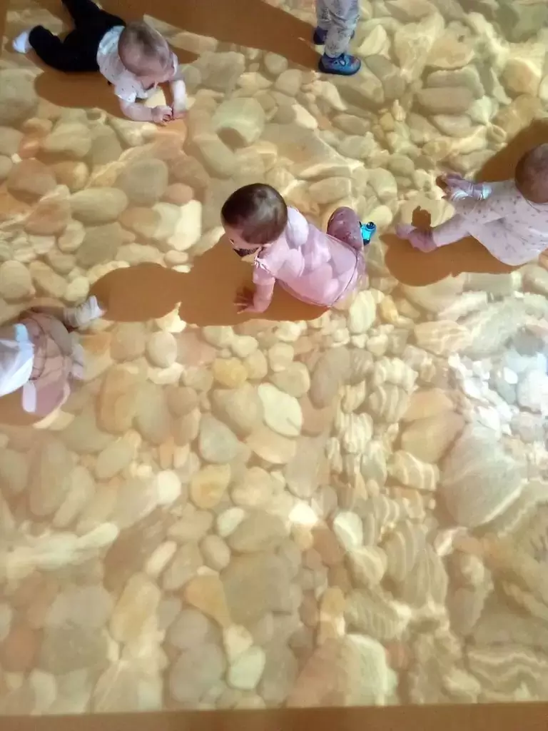 Maluszki z radością spędziły czas w basenie z kolorowymi kulkami, co wywołało dużo uśmiechu na ich twarzach. "Szafirki" uczestniczyły również w zabawach z matami sensorycznymi oraz tworzyły różne prace plastyczne, dzięki którym poznawały nowe faktury, barwy i wspierały rozwój motoryki małej. Kolejną atrakcją był magiczny dywan, na którym pojawiały się obrazy reagujące na ruch, wzbudzające duże zainteresowanie u dzieci. Maluchy próbowały dotykać przesuwających się elementów i śledziły zmieniające się obrazy.