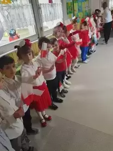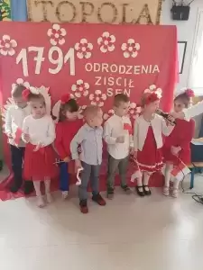 Przedszkolaki prezentowały się niezwykle uroczyście w galowych strojach w barwach ojczystych. Uroczystość przygotowały dzieci z grupy Leśne Duszki, pod przewodnictwem nauczycielek, Pani Urszuli Skiby i Pani Marii Furtak.