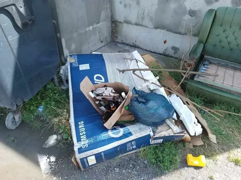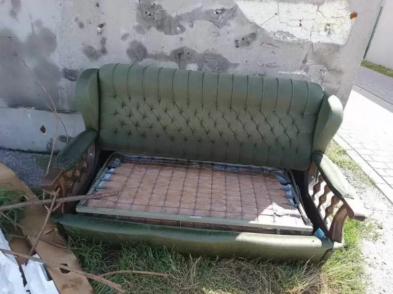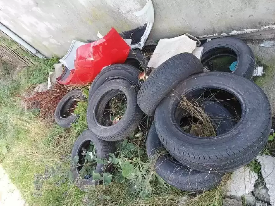 Jeśli to za mało, jeszcze „pokaźniejsza wystawa” ogumienia znajduje się na ul. Białoskórniczej. A do kolekcji: stara wersalka, elementy samochodu, tekturowe pudło po sprzęcie rtv, a na nim kolekcja butelek po napojach wyskokowych. Obraz jak z meksykańskiej dzielnicy ubóstwa i nędzy…