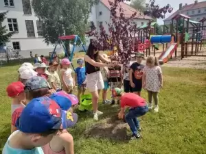 I tak nasze podwórko zostało wzbogacone pięknymi i pożytecznymi drzewami: „kotkowym” i „motylkowym”, w cieniu których za jakiś czas będą mogły w słoneczne, upalne dni schronić się kolejne grupy przedszkolaków. Mamy także nadzieję, że nasi przyszli absolwenci czasami nas odwiedzą i zobaczą jak posadzone przez nich rośliny wzrastają i upiększają teren wokół budynku przedszkola.