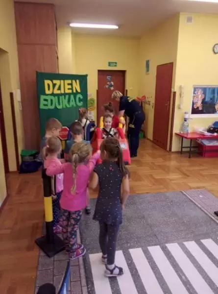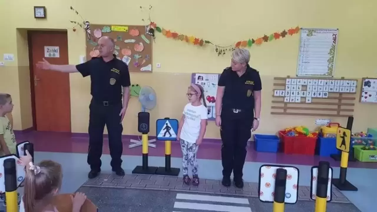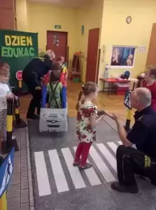 Strażnicy przynieśli ze sobą samochodziki, znaki drogowe i sygnalizację świetlną, aby móc bardzo dokładnie przedstawić dzieciakom co można, a czego nie można robić prowadząc auto lub w jaki sposób zachowujemy się na drodze będąc przechodniem.