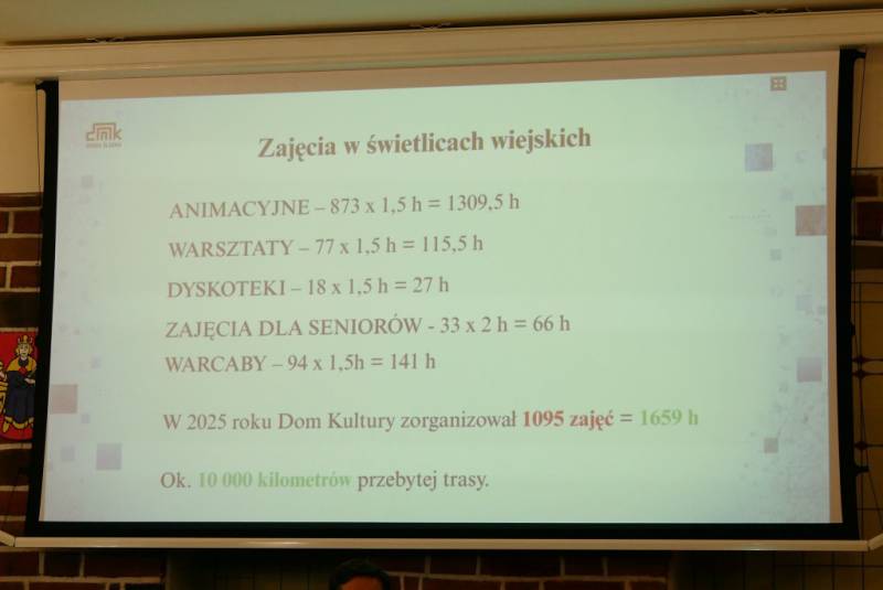 W formie prezentacji dyrektorzy Domu Kultury oraz Biblioteki Publicznej przedstawili sprawozdania z działalności swoich jednostek za 2025 rok. Miniony rok obfitował w liczne wydarzenia kulturalne, edukacyjne i integrujące mieszkańców, a zaprezentowane plany pokazują, że 2026 rok zapowiada się jeszcze ciekawiej i bogaciej w ofertę kulturalną dla mieszkańców gminy.