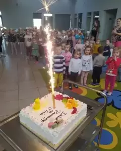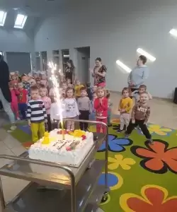 Były wspólne tańce, zagadki, dzieci poznały misie z bajek tych nowszych i starszych. Jednak największą atrakcją był słodki tort przygotowany dla naszego solenizanta.