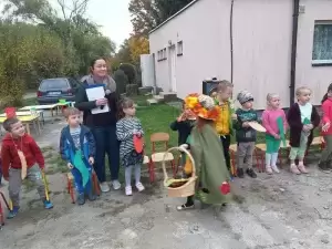 Dzieci z grupy pięciolatków rozpoczęły powitanie jesieni inscenizacją wierszy: "Jesień u fryzjera" i "Na straganie ". Następnie odbyły się konkursy: plastyczny na Portret Pani Jesieni oraz zagadki związane z tematem warzyw i owoców. Każda z grup przygotowała krótki występ.