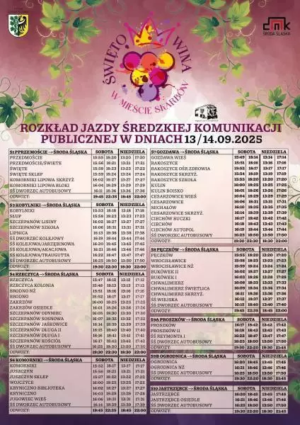13 i 14 września Średzka Komunikacja Publiczna uruchamia dodatkowe, BEZPŁATNE kursy na terenie miasta i gminy Środa Śląska. Dzięki nim wygodnie dotrzecie na miejsce wydarzenia i bezpiecznie wrócicie do domu – bez stresu i bez szukania parkingu. Szczegóły tras i godzin? — sprawdźcie rozkład jazdy na plakacie w galerii poniżej!