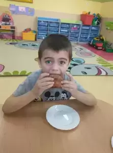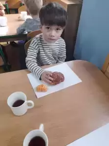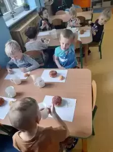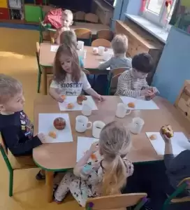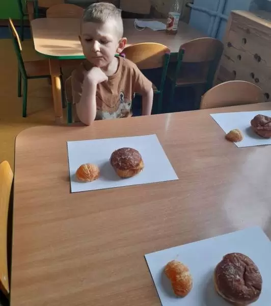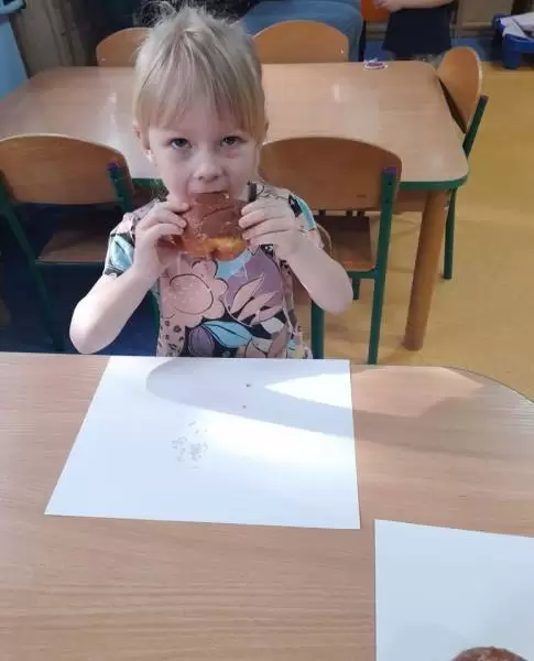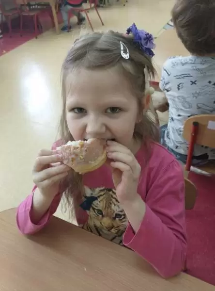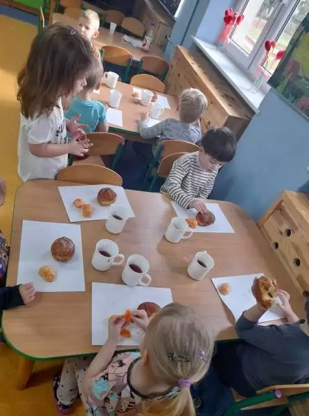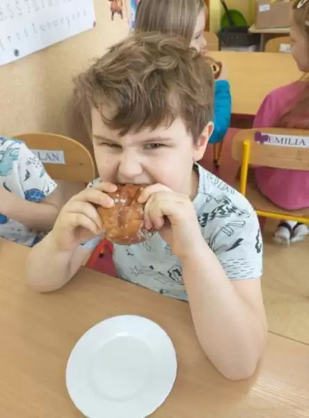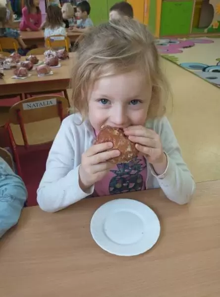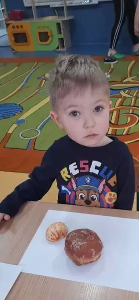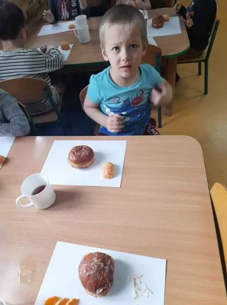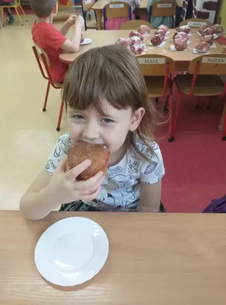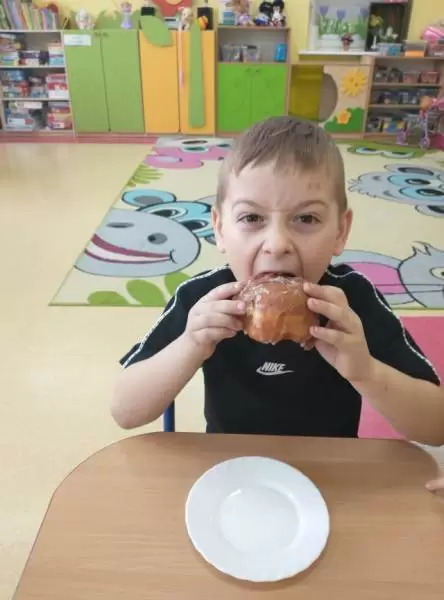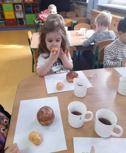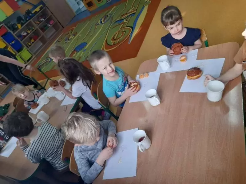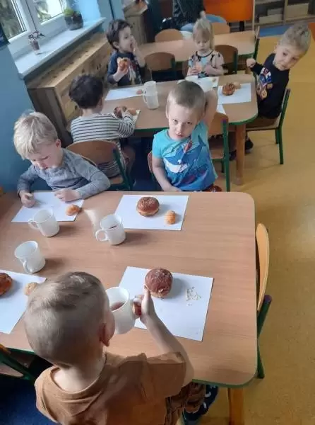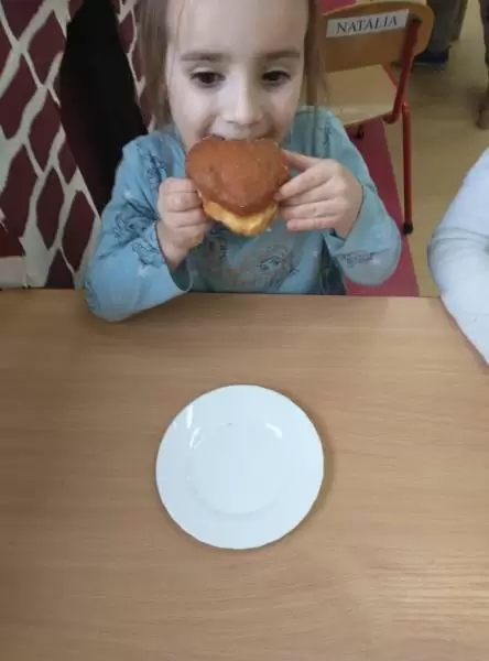 Dzieci degustowały pyszne pączki upieczone przez nasze kochane panie kucharki, które z pewnością przyniosą im dużo szczęścia! Czego bardzo życzymy!