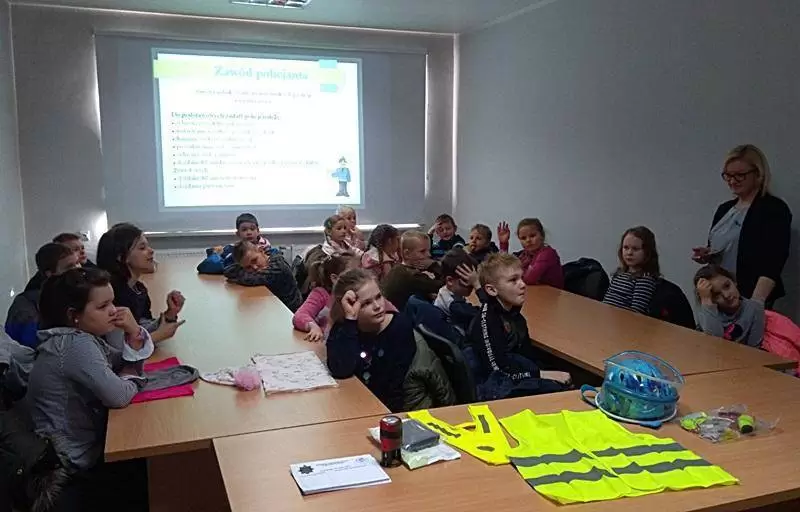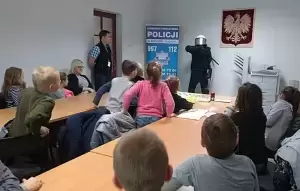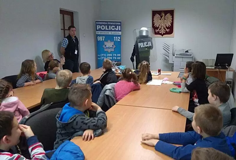 Uczniowie pierwszej klasy Szkoły Podstawowej nr 3 w Środzie Śląskiej rozpoczęli zwiedzanie budynku komendy od sali odpraw, gdzie obejrzeli prezentację multimedialną przybliżającą pracę policjanta, umundurowanie, wyposażenie oraz rodzaje poszczególnych służb.