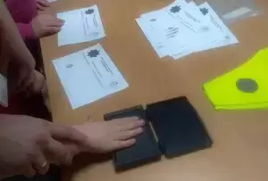 Dzieci otrzymały kolorowanki, a także miały możliwość wykonania odcisków palców na specjalnie przygotowanych kartach pamiątkowych.