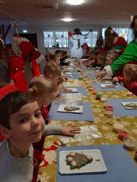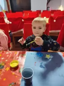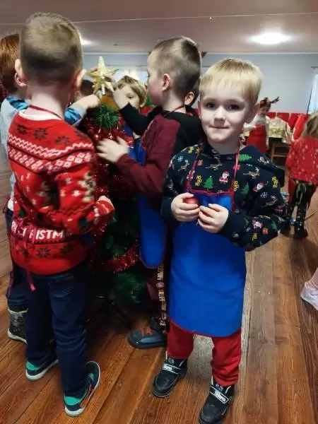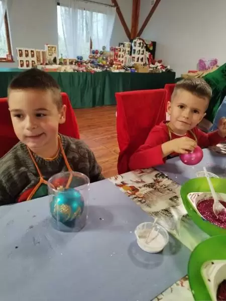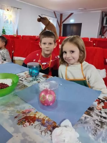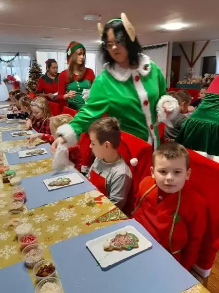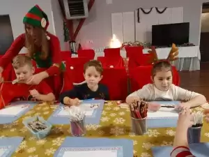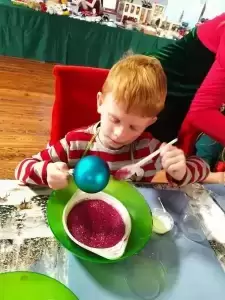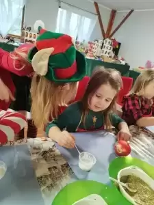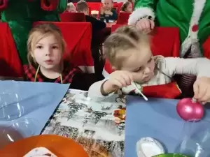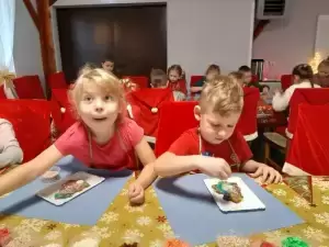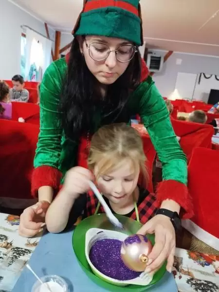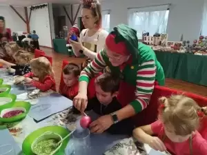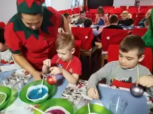 W trakcie wizyty razem ozdabialiśmy pierniczki dla Mikołaja. Do wyboru były naturalne lukry, bakalie i kolorowe posypki. Każdy mógł ozdobić tak jak podpowiadała mu wyobraźnia. Elfy pomagały w przygotowaniu gipsowych ozdób na Święta. Dzieci własnoręcznie malowały tradycyjną, szklaną bombkę obsypując ją kolorowymi brokatami.
