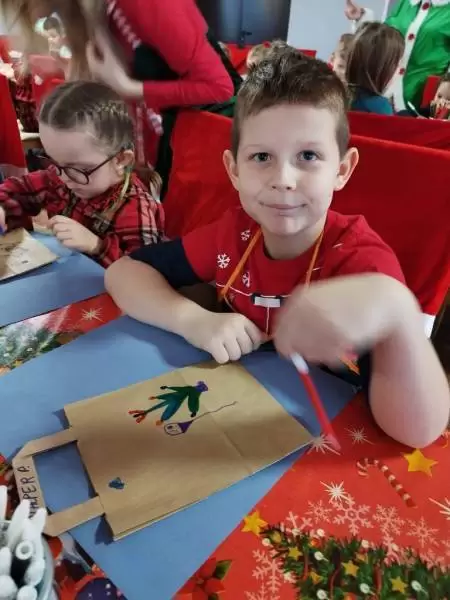 Dekorowana była także świąteczna torebka, do której spakowane zostały wszystkie upominki. Podczas spotkania był czas na wspólne zdjęcia, na napisanie listu do Mikołaja oraz nawet wspólne tańce!