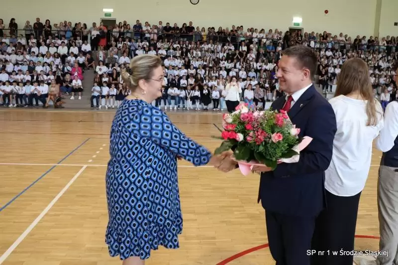 Dzisiejszy dzień był szczególny dla uczniów nowo powstałej Szkoły Podstawowej nr 1 na Winnej Górze w Środzie Śląskiej, którzy dziś rozpoczęli pierwszy historyczny rok szkolny dla nowej gminnej placówki. Uczniowie już za kilka miesięcy przeniosą się do nowego budynku przy ul. Winogronowej, dziś jeszcze korzystali z hali widowiskowej SP nr 3 przy ul. Górnej, gdzie spędzą jeszcze ten semestr. Poznaliśmy dyrektor nowej placówki – Agnieszkę Ambroszko oraz wicedyrektora Waldemara Masalskiego, nieobecna była zaś wicedyrektor Bożena Basa. Przedstawili się uczniowie wybrani do samorządu uczniowskiego. Gospodarzy nowej szkoły powitał burmistrz Adam Ruciński, który złożył gratulacje objęcia stanowiska na ręce dyrektor SP nr 1.