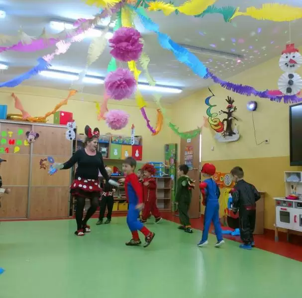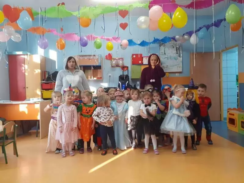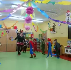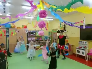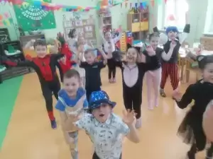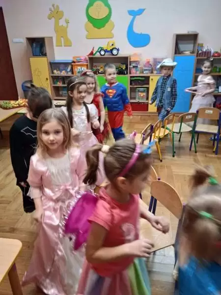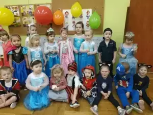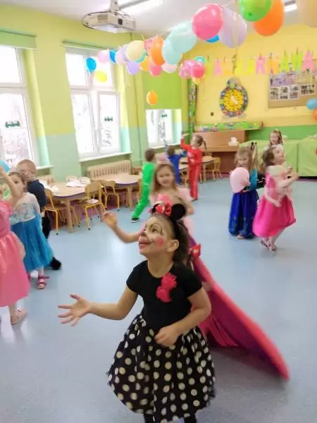 Przedszkolaki przebrane były w barwne, kolorowe i pomysłowe stroje, odzwierciedlające bohaterów ulubionych bajek. W tych dniach nie mogło zabraknąć tańców przy rytmach wesołej muzyki, zabaw i konkursów.