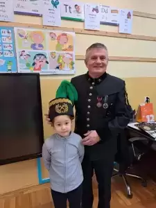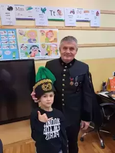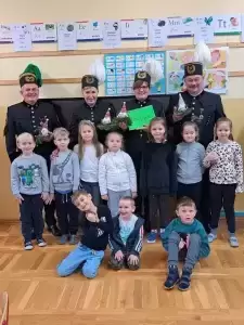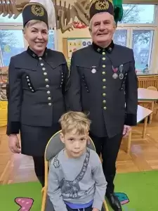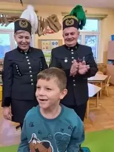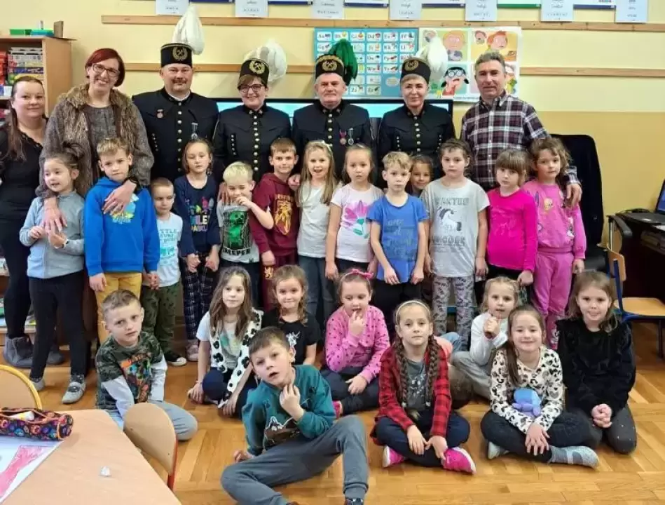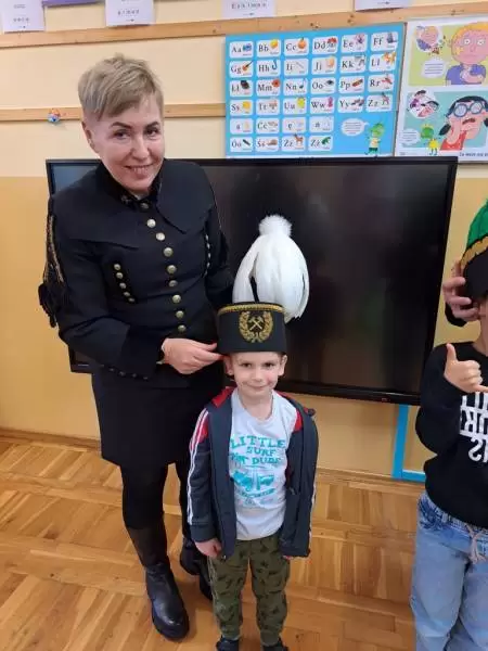 Prezes Zarządu - pan Janusz Kozyrski opowiedział o ciężkiej i często niebezpiecznej pracy wykonywanej w tym zawodzie. Przybliżył uczniom wszystkie skarby, jakie kryje ziemia. Dzieci miały również okazję przyjrzeć się z bliska mundurowi galowemu oraz czapce górniczej "czako", przystrojonej pióropuszem, którego kolor odpowiada wykonywanej funkcji w kopalni. Biały pióropusz oznacza sztygara, czerwony nosi orkiestra, biało - czerwony noszą panie, które pracują na powierzchni kopalni, zielony ma dyrekcja, a najwięcej jest czarnych, które noszą górnicy pracujący pod ziemią. Doświadczony górnik wyjaśnił również jakiego rodzaju odznaczenia otrzymują górnicy za zasługi i długoletnią pracę.
