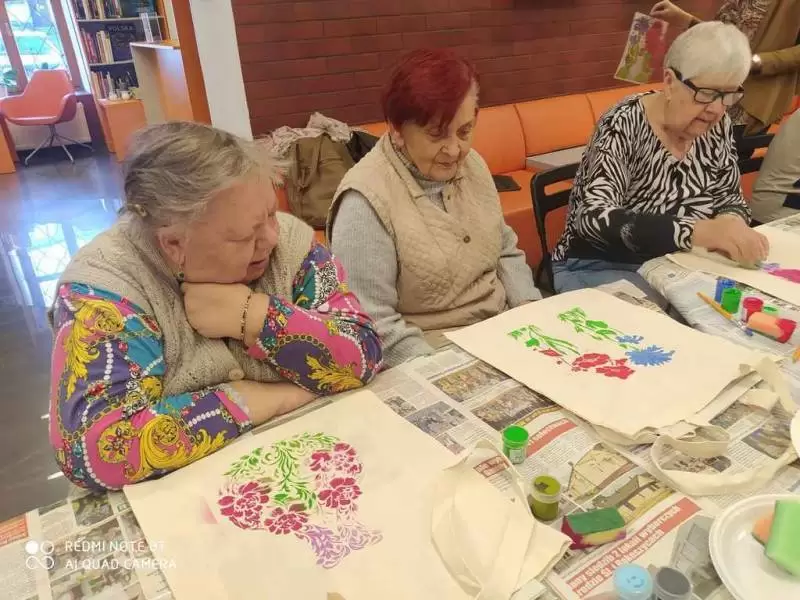 Była to pierwsza wizyta seniorów w Bibliotece Publicznej. Z pomocą Pani Gabrieli seniorzy ozdobili torby, które będą przypominać seniorom o tym dniu. Była to także okazja dla seniorów, żeby zwiedzić Bibliotekę i zapoznać się z jej działalnością. Seniorzy byli pod wrażeniem miejsca i gościnności.