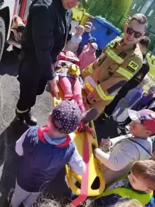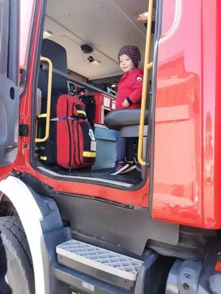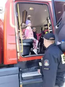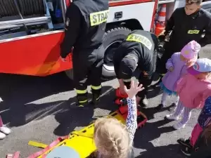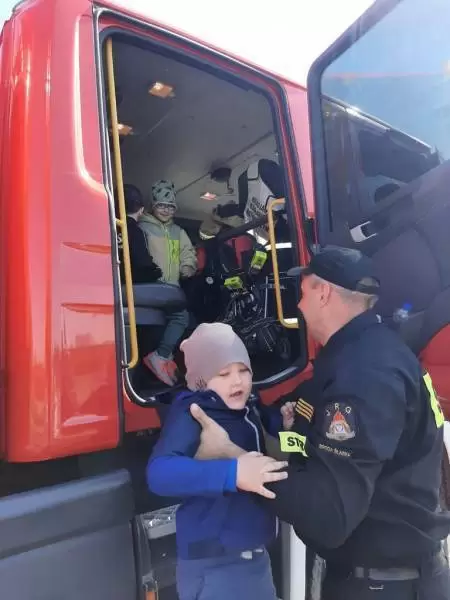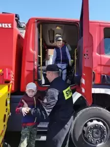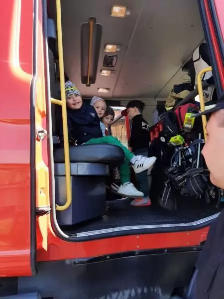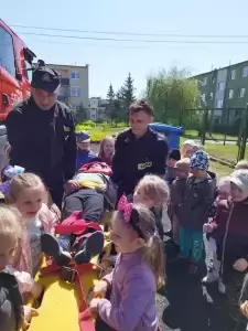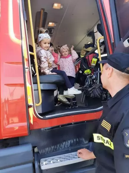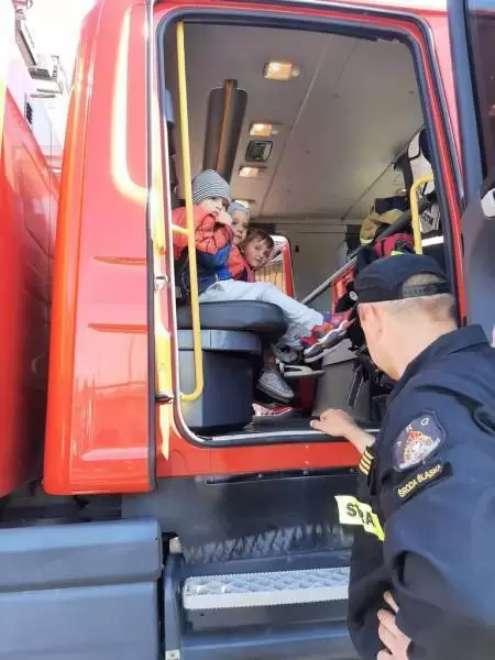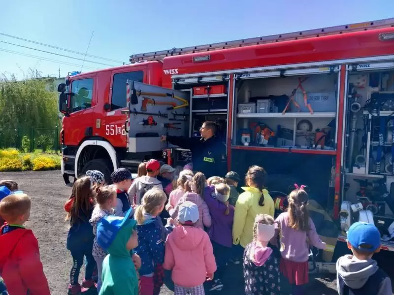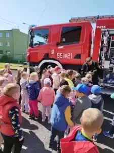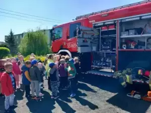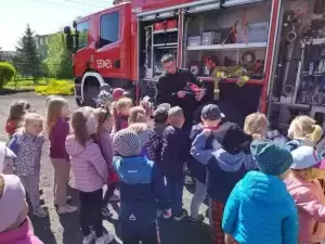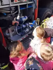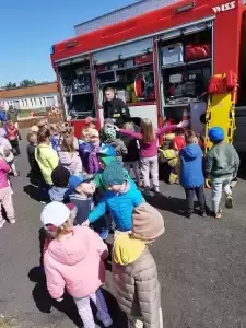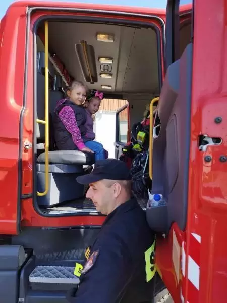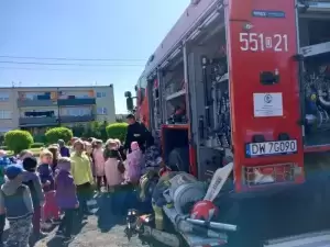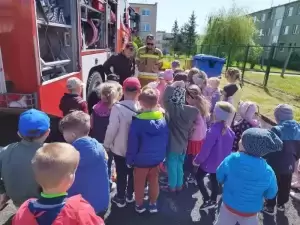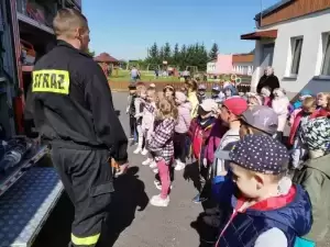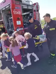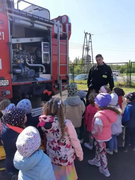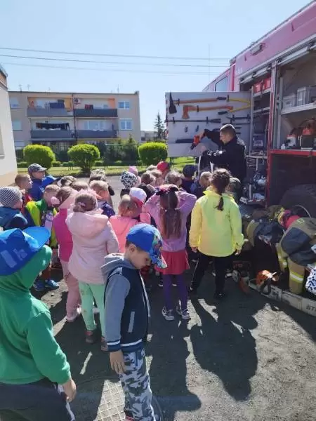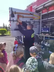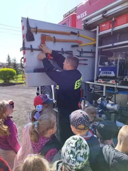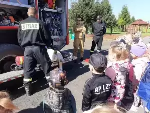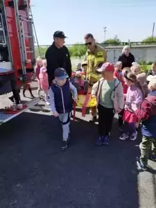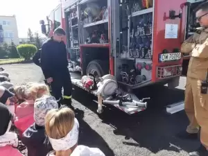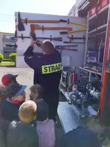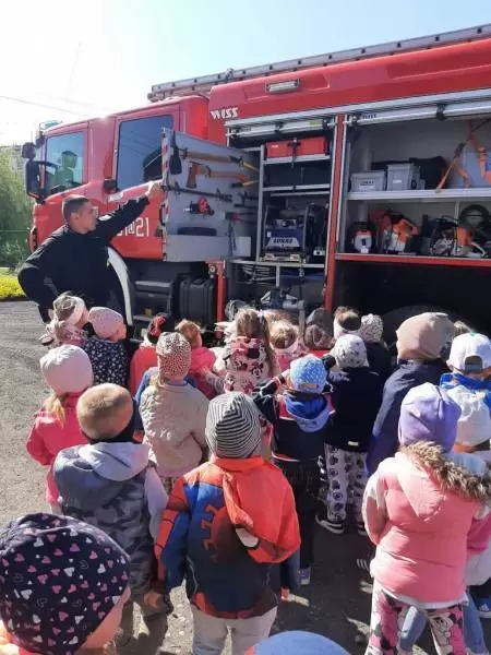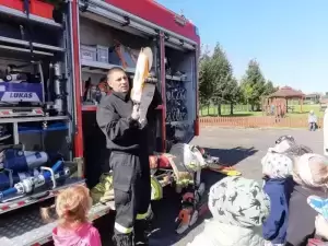 Największe zainteresowanie wzbudził wóz strażacki. Dzieci podziwiały jego wyposażenie i sprzęt jakim strażacy dysponują w akcjach.