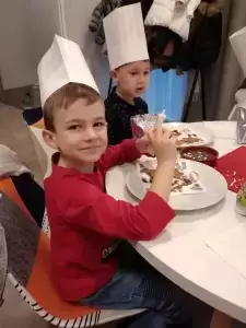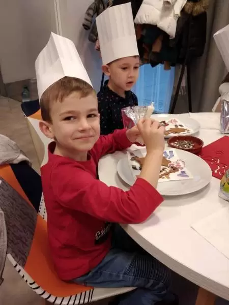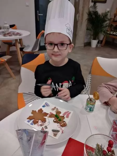Wizyta wyjątkowego gościa wprowadziła wszystkich w radosny klimat zbliżających się Świąt Bożego Narodzenia. Przedszkolaki z grupy ,,Kotki'' miały przyjemność uczestniczyć w niezwykłych warsztatach cukierniczych zorganizowanych przez Państwa Agnieszkę i Mariusza Komendów, właścicieli restauracji Sztuka Restaurant. Zanim przedszkolaki zaczęły dekorować pierniczki, każdy dostał czapkę ze swoim imieniem na miarę prawdziwego Masterchefa.