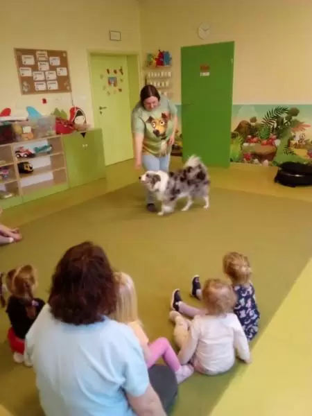Dzieci były bardzo ciekawe naszego gościa. Ogromną radość sprawiło im, gdy mogły pobawić się z pieskiem piłką, poczęstować go smakołykami oraz pogłaskać. Salitka zaprezentowała również szereg sztuczek, których się nauczyła – wśród nich przybijanie „piątek”, slalom oraz łapanie przysmaków.