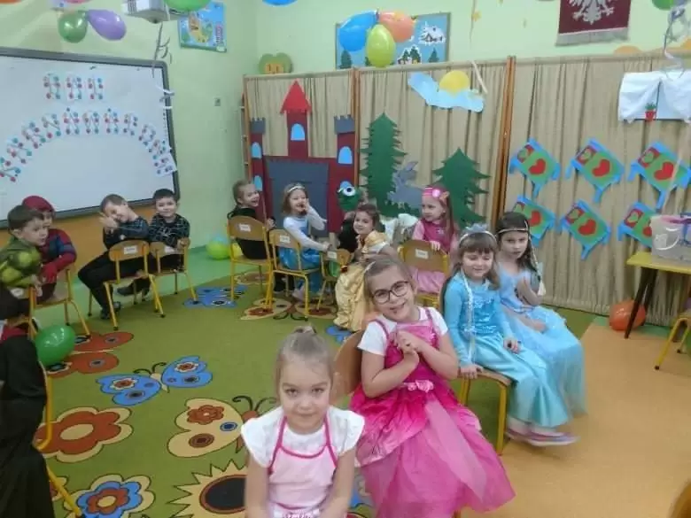 W naszym przedszkolu także odbył się taki bal, podczas którego najmłodsi uczestnicy mieli możliwość wspólnego tańczenia i śpiewania. Niezliczone księżniczki, towarzyszący im kowboje, Indianie, krasnoludki, królewny, motylki, myszki, kotki, krakowianki, policjanci, smok oraz Batman ze Spider-Manem, a także inne postacie z kreskówek opanowały na kilka godzin sale przedszkolne.