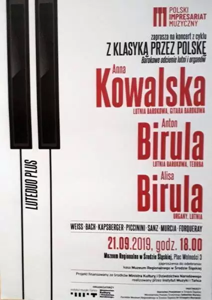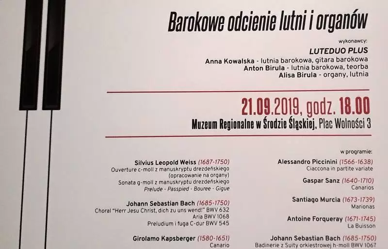 Polski Impresariat Muzyczny zaprasza na koncert z cyklu "Z klasyką przez Polskę, barkowe odcienie lutni i organów", który odbędzie się w sobotę 21.09.2019 r. o godzinie 18:00 w Muzeum Regionalnym w Środzie Śląskiej.