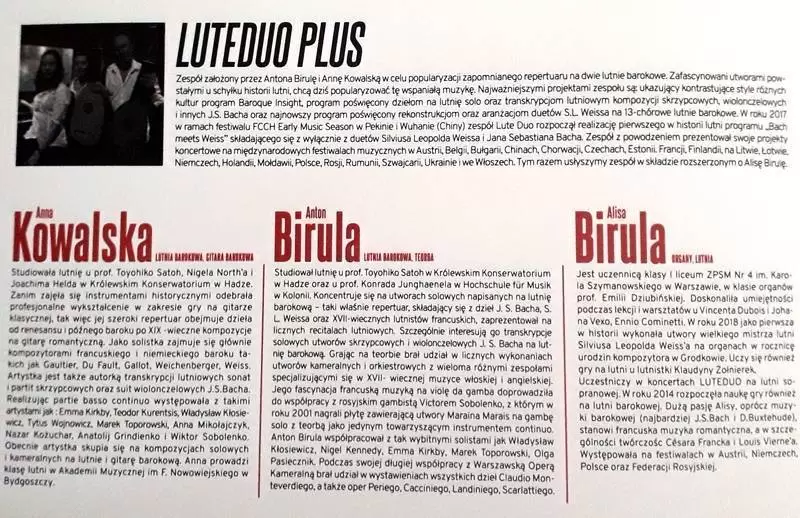 Wystąpią LUTEDUO PLUS – zespół założony przez Antona Birulę i Annę Kowalską w celu popularyzacji zapomnianego repertuaru na dwie lutnie barokowe. Zafascynowani utworami stałymi u schyłku historii lutni, chcą dziś popularyzować tę wspaniałą muzykę.