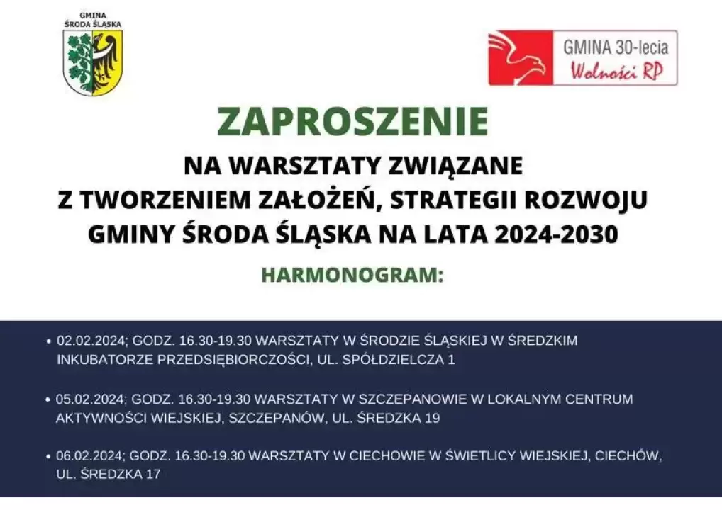 Zaproszenie na warsztaty związane z tworzeniem założeń Strategii Rozwoju Gminy Środa Śląska na lata 2024-2030