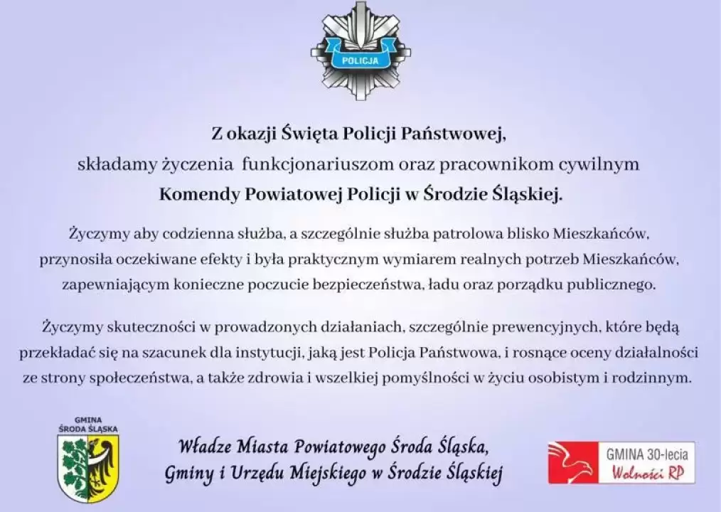 Życzenia dla Policji od władz Miasta Powiatowego, Gminy i UM Środa Śląska