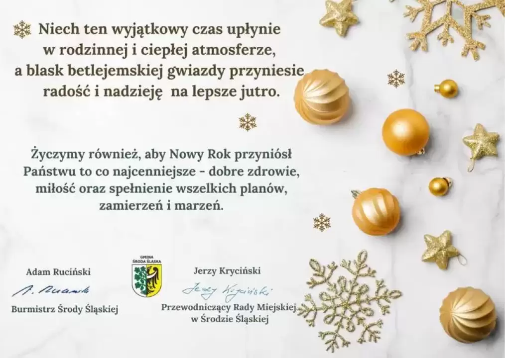 Serdeczne życzenia świąteczno-noworoczne składają Państwu - Burmistrz Środy Śląskiej Adam Ruciński i Przewodniczący Rady Miejskiej w Środzie Śląskiej Jerzy Kryciński.