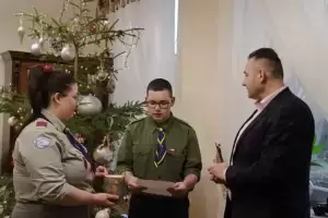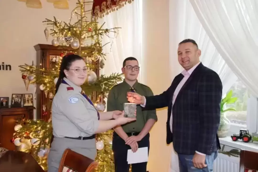 Dziś (tj. 21.12.2022 r.) wójt Gminy Udanin Wojciech Płaziuk odebrał z rąk przedstawicieli 13. Grunwaldzkiej Średzkiej Drużyny Harcerskiej "Krzesiwo" Betlejemskie Światło Pokoju.