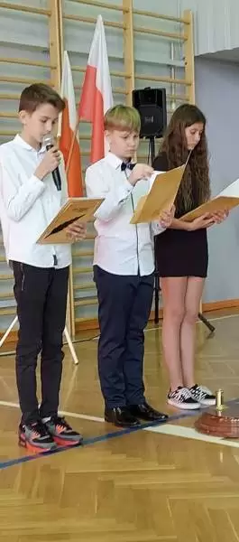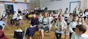 Na początku uroczystości dyrektor Bożena Basa oraz przybyli goście skierowali do zebranych życzenia oraz wiele ciepłych słów. Był także bukiet kwiatów od pana wójta i smaczny tort ufundowany przez Radę Rodziców.