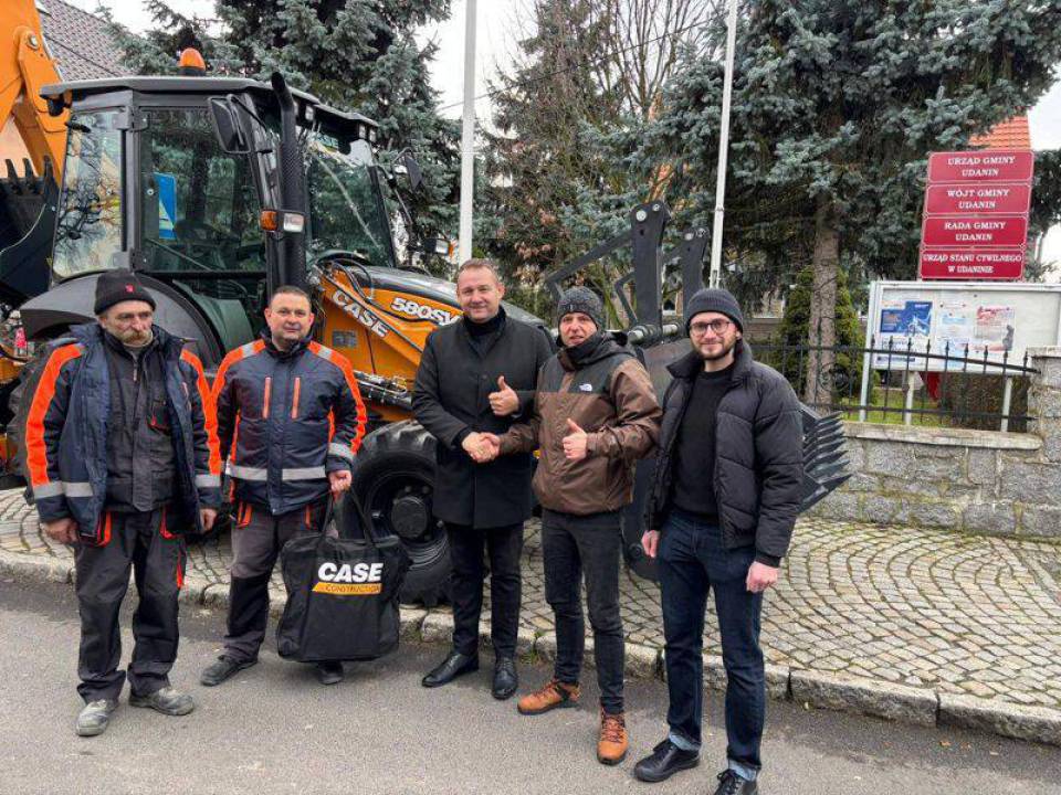 Przed Urzędem Gminy w Udaninie Wójt Wojciech Płaziuk, w obecności pracowników urzędu oraz przedstawiciela dostawcy, dokonał oficjalnego odbioru koparko-ładowarki.