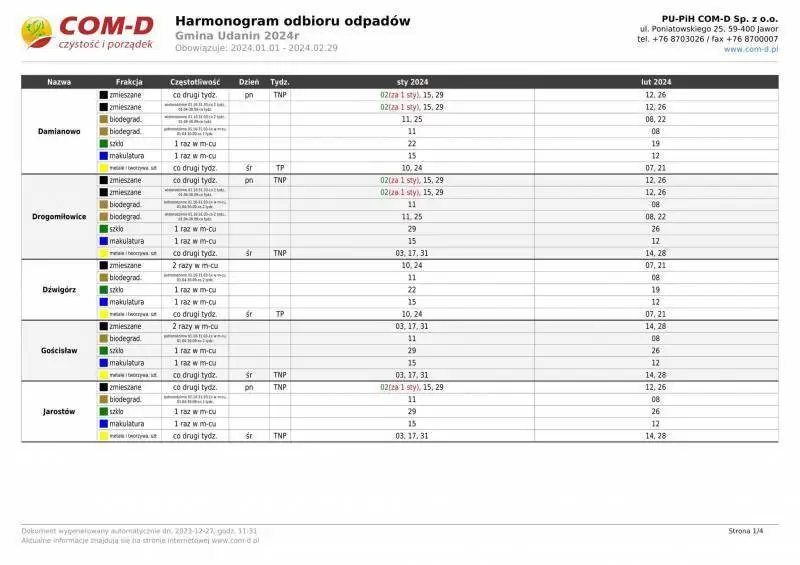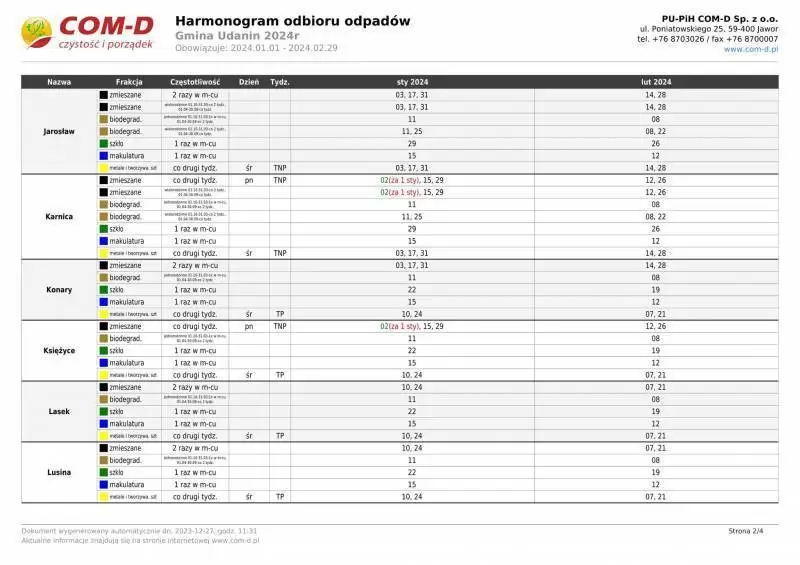 Harmonogram odbioru odpadów z terenu Gminy Udanin na rok 2024
