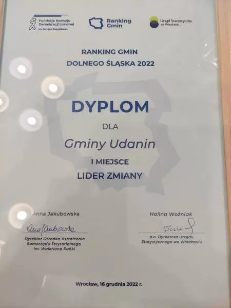 W tym tygodniu dotarł do nas Dyplom za zajęcie I miejsca w kategorii ,,Lider Zmiany”. Gmina Udanin zanotowała najwyższy awans w historii Rankingu Gmin w województwie dolnośląskim.