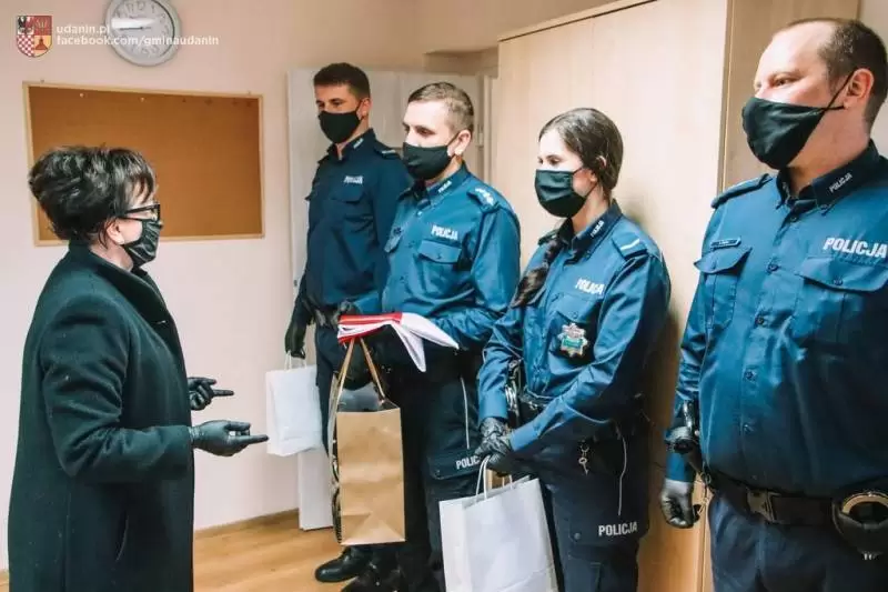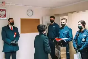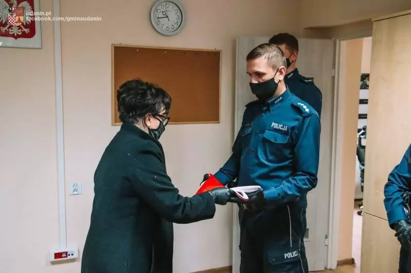 Podczas spotkania przekazała na ręce Kierownika Posterunku flagę państwową, która docelowo zawiśnie na maszcie przy pomniku "Obrońców Ojczyzny" w Udaninie.