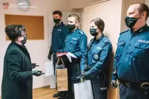Z okazji Dnia Flagi Rzeczypospolitej Polskiej Marszałek Sejmu Elżbieta Witek - Poseł na Sejm RP spotkała się z funkcjonariuszami Polska Policja na posterunku policji w Udaninie.