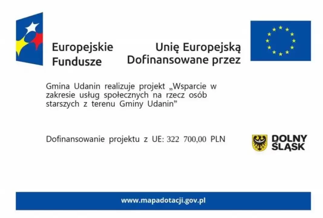 24 września 2025 r. Gmina Udanin podpisała umowę z Dolnośląskim Wojewódzkim Urzędem Pracy we Wrocławiu, pełniącym rolę Instytucji Pośredniczącej Funduszami Europejskimi dla Dolnego Śląska 2021–2027, na realizację zadania: „Wsparcie w zakresie usług społecznych na rzecz osób starszych z terenu Gminy Udanin”.