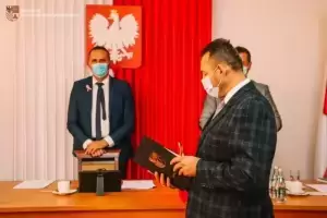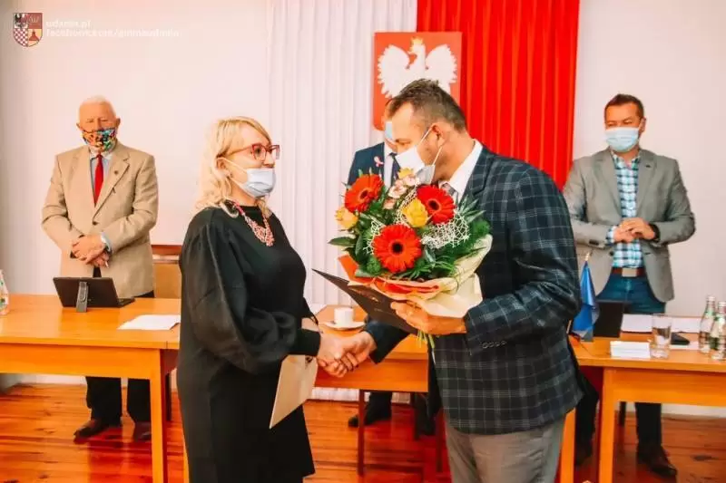 Ślubowanie złożyła Pani Justyna Rosińska-Tłusty, nauczycielka ze Szkoły Podstawowej im. Adama Mickiewicza w Udaninie, która z rąk wójta Wojciecha Płaziuka otrzymała akt nadania stopnia awansu zawodowego oraz bukiet kwiatów.
