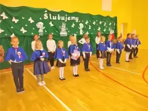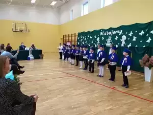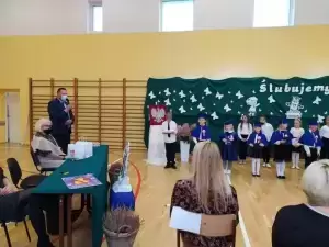Najpierw odczytano list od dyrektora szkoły p. Doroty Byry, potem miał miejsce krótki występ, a następnie uczniowie klasy I złożyli ślubowanie. Wychowawca p. Justyna Pilarska wspólnie z wójtem dokonali uroczystego aktu pasowania dzieci na uczniów. Towarzyszyła temu podniosła atmosfera, a na buziach dzieci rysowały się wielkie emocje.