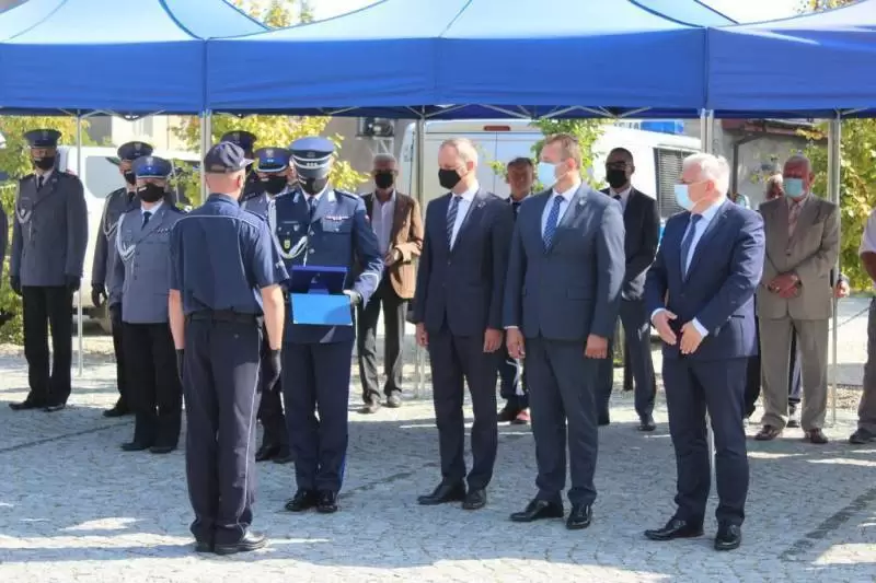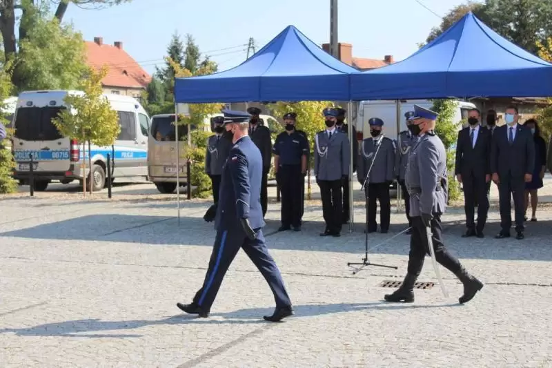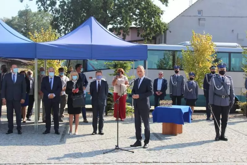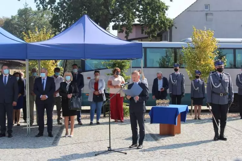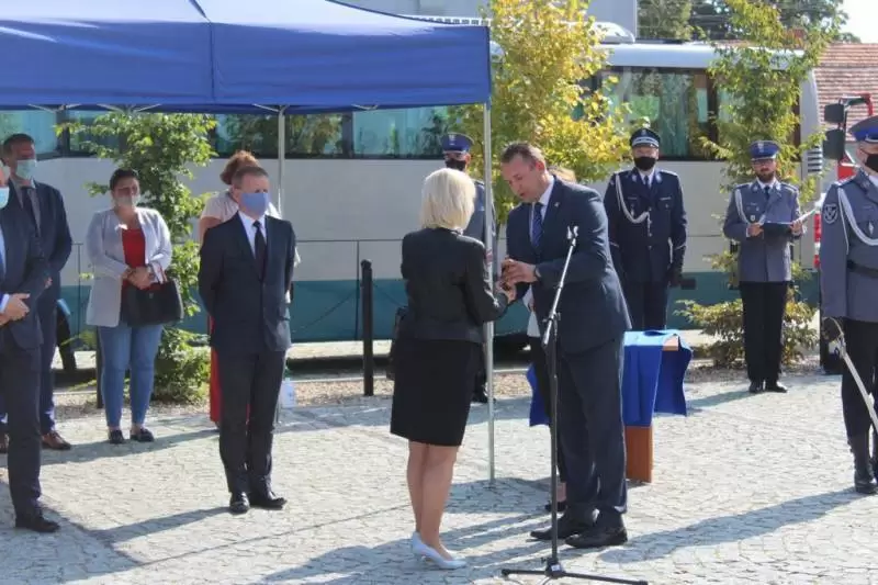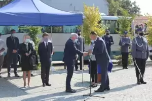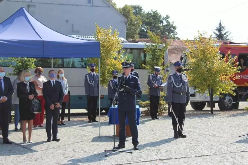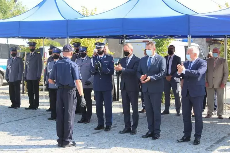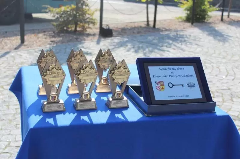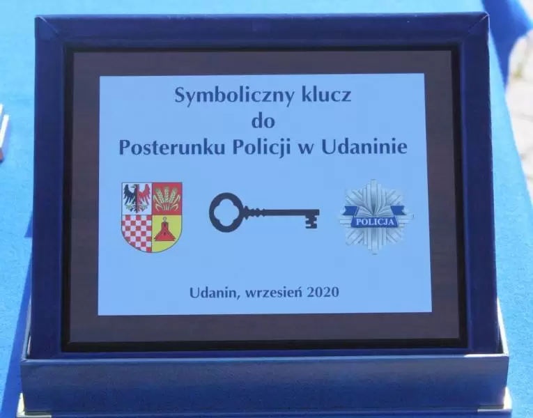 Symboliczny klucz na ręce kierownika Posterunku Policji w Udaninie Marka Bednarza wręczyli poseł na sejm RP Paweł Hreniak, komendant wojewódzki policji we Wrocławiu insp. Dariusz Wesołowski, wicewojewoda dolnośląski Bogusław Szpytma oraz wójt gminy Udanin Wojciech Płaziuk.