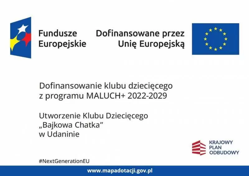 Dofinansowanie z Krajowego Planu na rzecz Odbudowy i Zwiększenia Odporności w ramach inwestycji pn. Wsparcie programów dofinansowania miejsc opieki nad dziećmi 0-3 lat (żłobki, kluby dziecięce) w ramach AKTYWNY MALUCH+ 2022-2029, w ramach priorytetu 3 programu Fundusze Europejskie dla Rozwoju Społecznego 2021-2027.