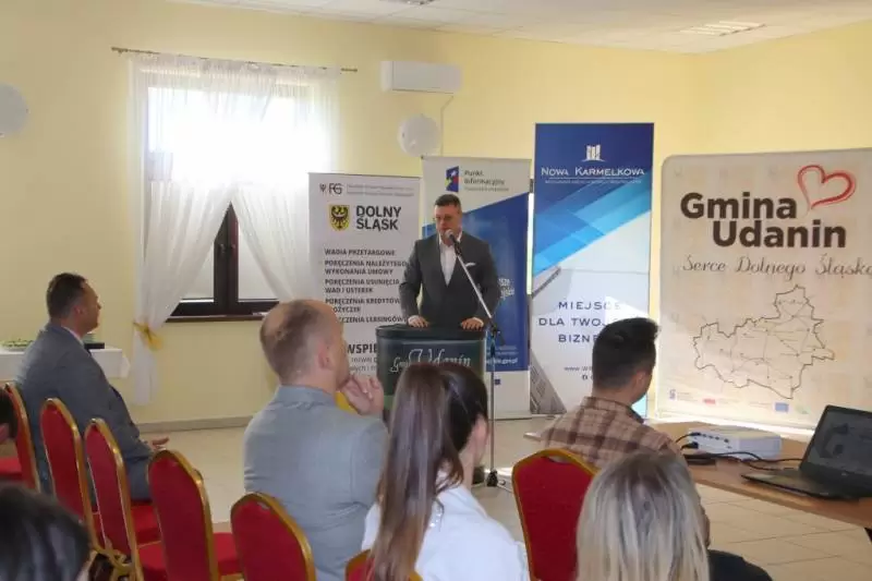 Spotkanie otworzył wójt Gminy Udanin Wojciech Płaziuk zapraszając gości do współpracy, zaprezentował działalność Gminy Udanin oraz tereny inwestycyjne leżące na jej terenie i zarys formy spotkania. Zakres merytoryczny omówił Jerzy Michalak przedstawiciel UMWD Dyrektor Departamentu Rozwoju Aglomeracji.