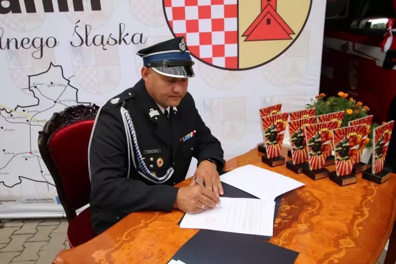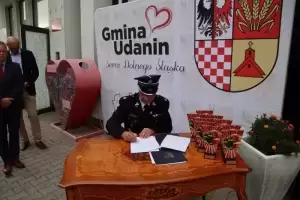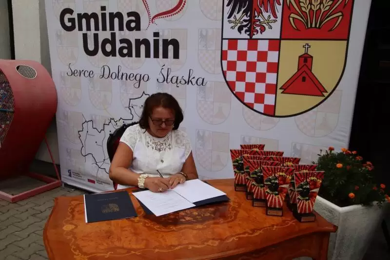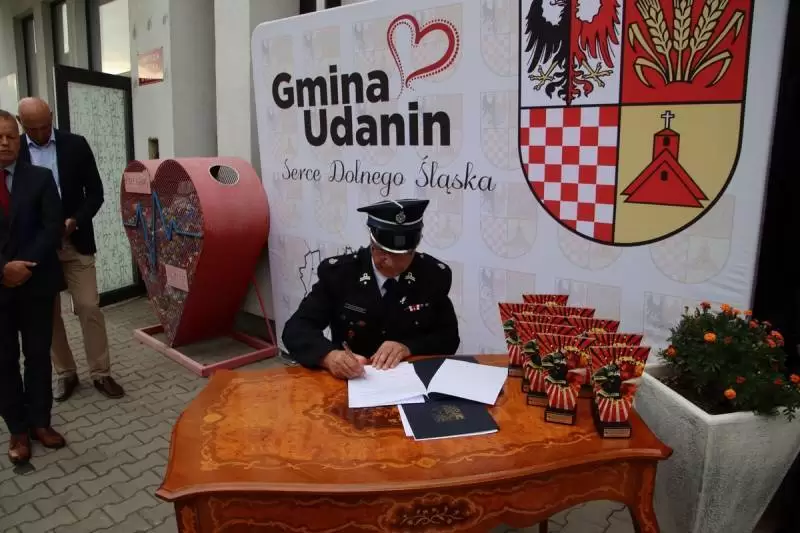 Centralnym punktem uroczystości było podpisanie przez Wójta Gminy Udanin Wojciecha Płaziuka przy kontrasygnacie Skarbnika Gminy Udanin Mieczysławy Sochy umowy darowizny samochodu na rzecz jednostki OSP Udanin, którą reprezentował Prezes Zarządu OSP Udanin Tadeusz Brzozowski. Wartość samochodu to 249 936,00 zł, gdzie wkład własny Gminy Udanin wyniósł 2 500,00 zł. Pozostała kwota 247 436,00 zł została przekazana w ramach dotacji z Funduszu Sprawiedliwości, którego dysponentem jest Minister Sprawiedliwości.