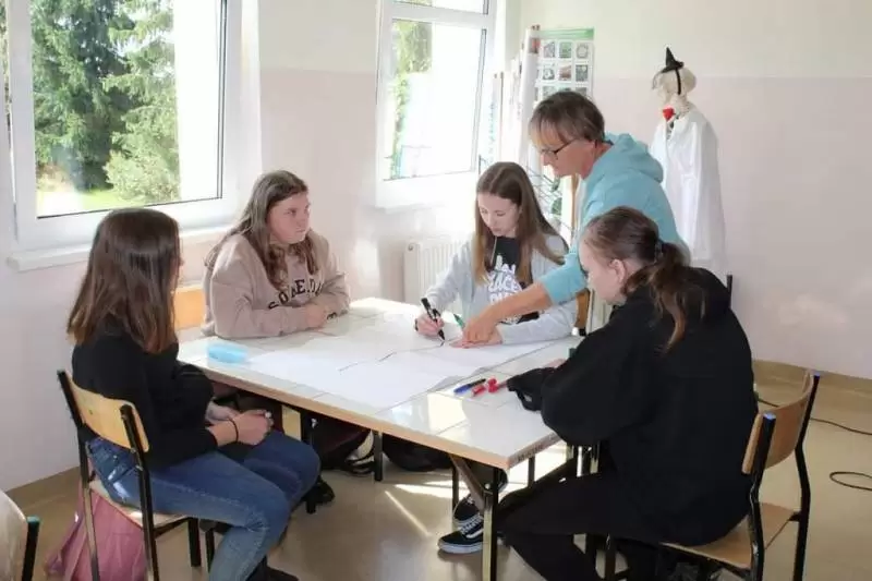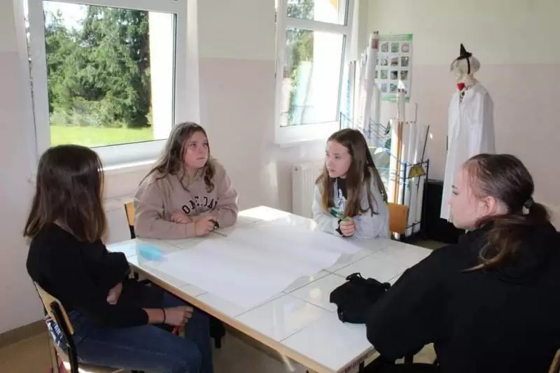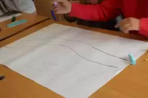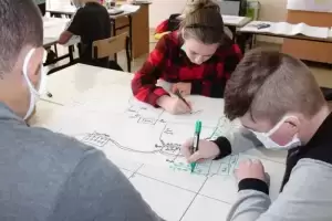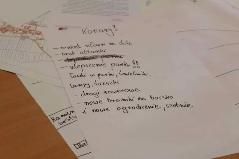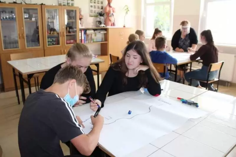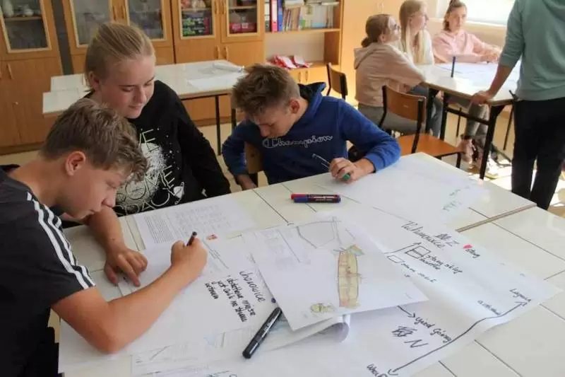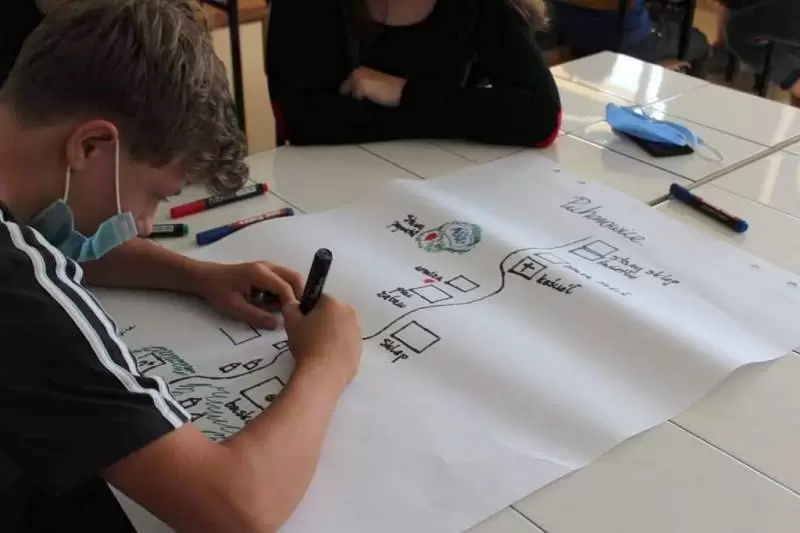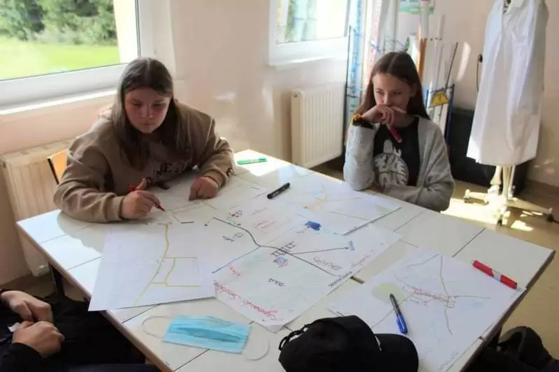 Uczniowie zostali poproszeni o wykonanie na planszy mapki swojej miejscowości z lotu ptaka, mieli zaznaczyć: najważniejsze budynki, kościół, szkołę, plac zabaw, przystanki, parkingi, zadrzewienia. Dodatkowo opisać na planie oznaczenia gdzie jest północ, południe, wschód i zachód.