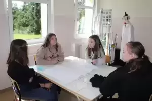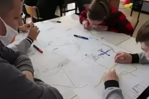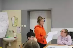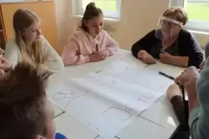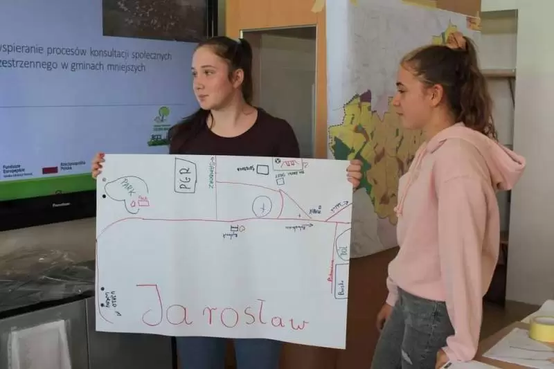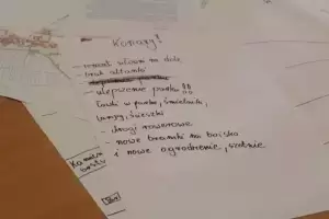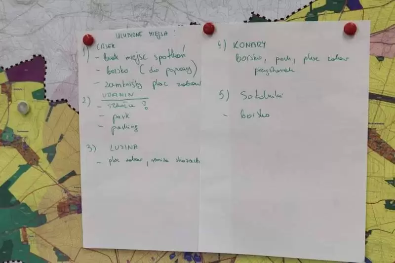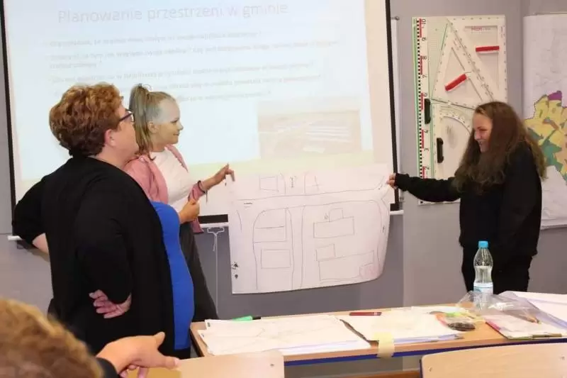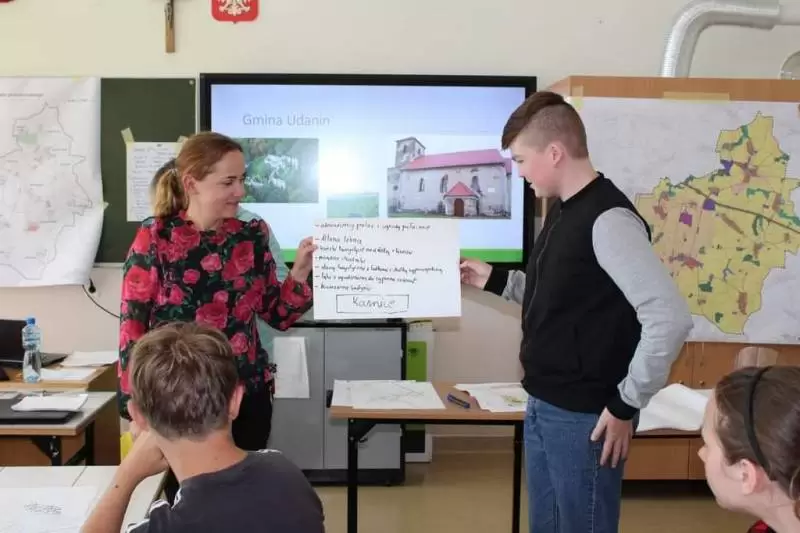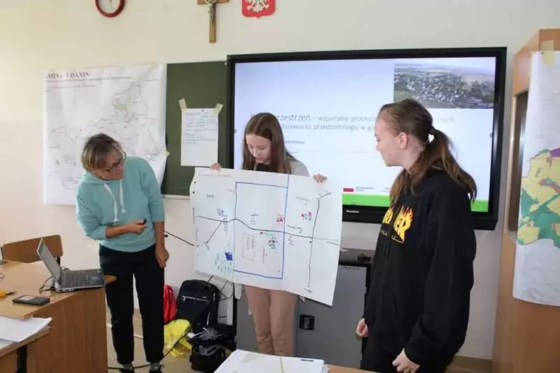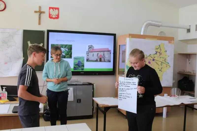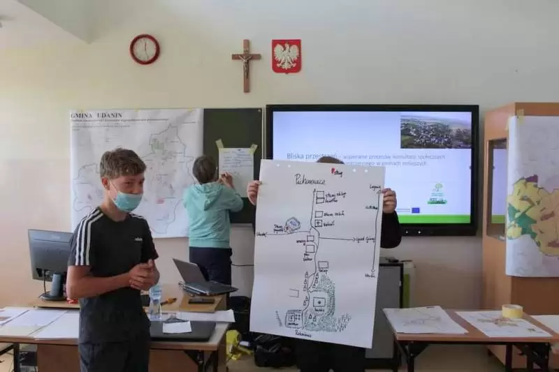 Następnie młodzież zaznaczyła serduszkami miejsca, w których lubią przebywać. Każda grupa podczas krótkiej prezentacji przedstawiła swoją mapkę z lotu ptaka. Uczniowie omówili co powoduje, że zaznaczone miejsca są ich ulubionym? Musieli także się zastanowić jak mają wyglądać zamieszkiwane przez nich wsie, jak również gmina Udanin za 10 lat. Swoje pomysły zaprezentowali całej grupie wraz z uzasadnieniem co powinno się zmienić, aby lepiej się żyło mieszkańcom.