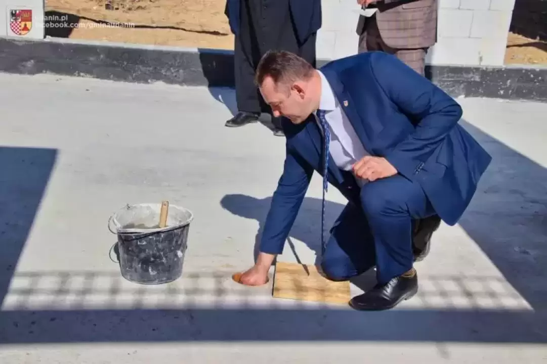 Uroczystość zakończono symbolicznym wmurowaniem kapsuły w kamień węgielny, którego dokonali wójt i zaproszeni goście.